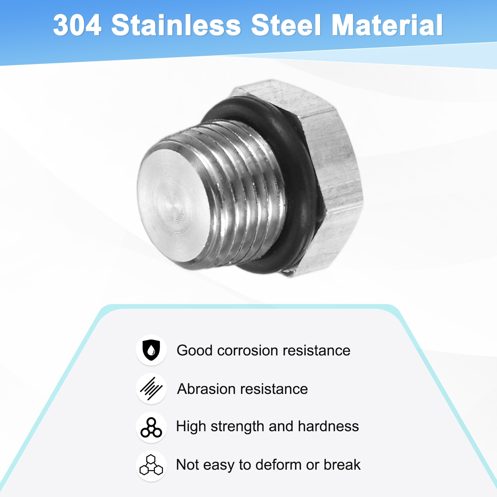 Outer Hex Head Thread Pipe Plug Fitting, 304 Stainless Steel Solid Thread Bung Plug with Sealing Ring - Silver