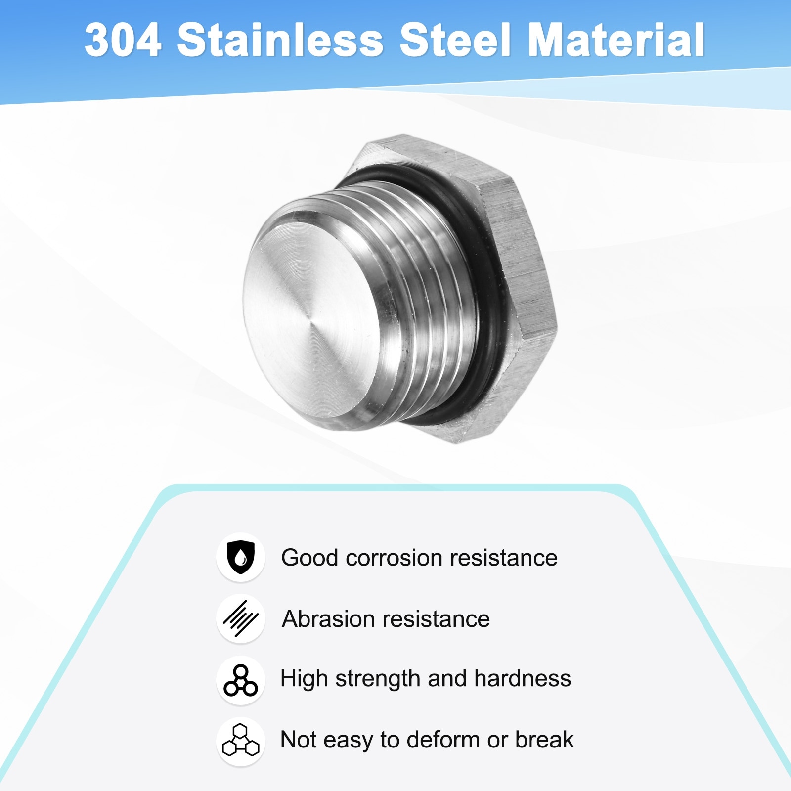 Outer Hex Head Thread Pipe Plug Fitting, 304 Stainless Steel Solid Thread Bung Plug with Sealing Ring - Silver