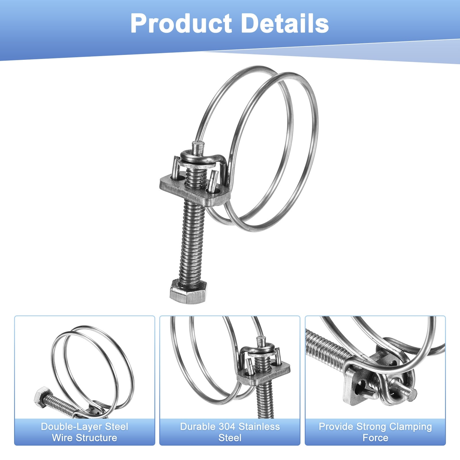 Double Wire Hose Clamp, Stainless Steel Hose Clips Pipe Tube Clamps with Bolt Adjustable for Dust Collection Hose - Silver